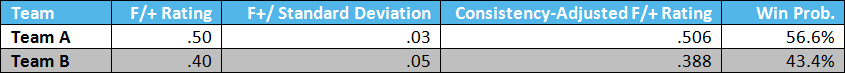 This was defined to be the “Consistency Score.” After we obtained a particular team’s F/+ rating and the Consistency Score (standard deviation) of its F/+ rating, we developed a probability distribution of F/+ ratings for each team. We set the average of the distribution to the team’s F/+ rating, and its standard deviation to the team’s consistency score. We randomly drew from this distribution 1000 times to determine a team’s “consistency-adjusted” F/+ score, taking into account the team’s consistency.
