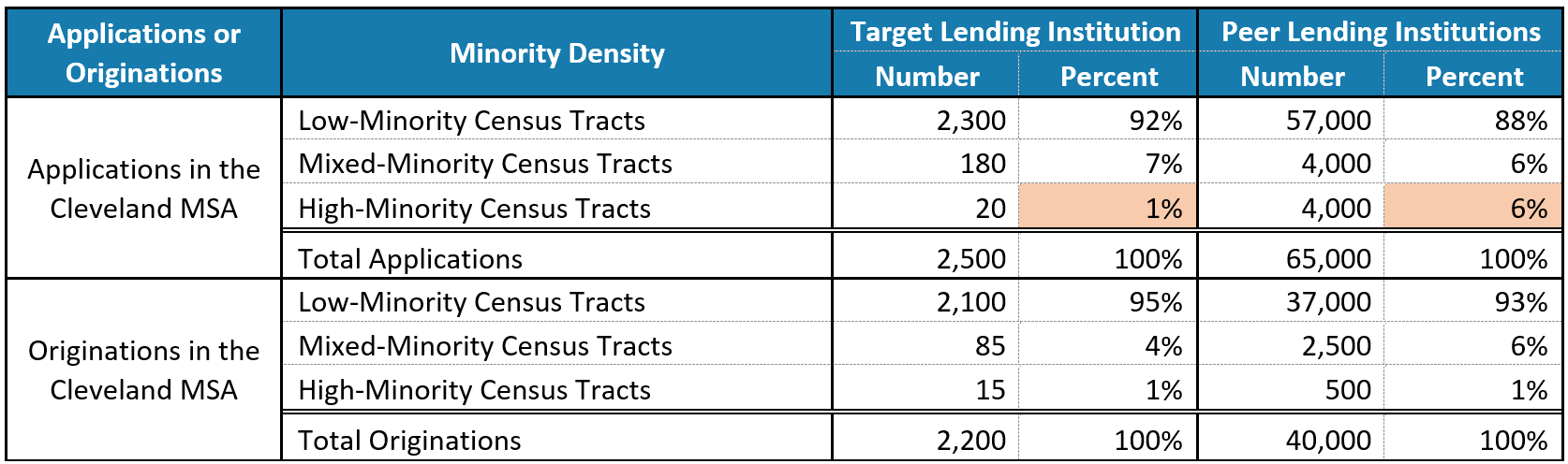 We identify peer lending institutions that are in the same geographic area and similar in size and lending capacity. First, we compare loan applications and originations in each minority density grouping (both low-minority and high-minority census tracts). Shortfalls in applications in high-minority areas relative to their peers may indicate that the lending institution’s marketing or business development teams are following discriminatory practices (for example, the lender does not market in high-minority neighborhoods). Shortfalls in originations in these neighborhoods compared to their peers may indicate that redlining is occurring in the approval process.