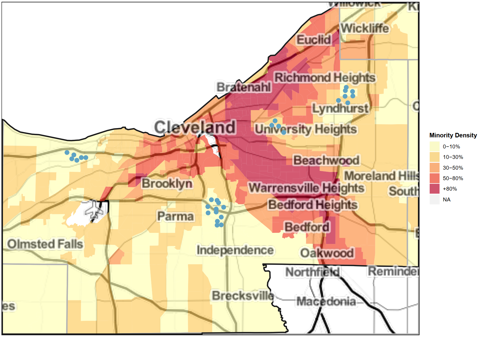 In the example map below, we show properties for which a hypothetical lending institution in the Cleveland metropolitan statistical area (MSA) approved loans. This lender appears to be engaging in redlining because most of the properties, shown as blue circles, are in neighborhoods with low minority populations (those with yellow or light orange shading). Although this map does not confirm that this lender is redlining minority neighborhoods, it does provide preliminary indications of redlining that should be explored further. We would then perform additional analyses to confirm the existence of redlining.