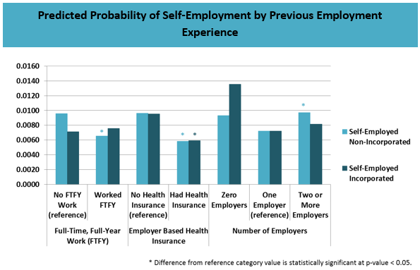 On the other hand, previous employment experience did not have much effect on a person’s likelihood of having an incorporated business. Neither previous full-time, full-year work nor the number of employers was significantly associated with having an incorporated business rather than wage employment. Likewise, being unemployed in the previous year was not significantly associated with having an incorporated business. However, workers with employer based health insurance were less likely to have an incorporated business rather than wage employment.