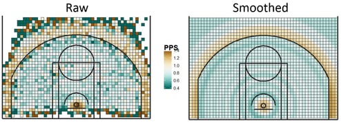 In order to smooth the field goal rates, I first transformed the space of the basketball court into polar coordinates as I assumed that the probability of making a shot was a function of the shot’s distance from the basket and the angle of the shot. Then, I used a generalized additive model, which allowed me to estimate probabilities from each point as a smooth nonlinear function of the angle and distance from the basket.