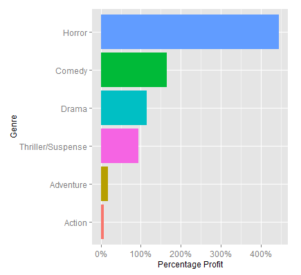 Before we jump head-first into production mode, we thought it would be a good idea to look at movies released in 2013 and see if there were any trends in movie goers’ preferences. After scraping data online and doing some cleaning, we ended up with a dataset of 148 movies in six different genres (horror, thriller/suspense, comedy, action, drama, and adventure). In addition to genre, we also pulled data on each movie’s production budget and domestic box office revenue. We used these to calculate profit percentage and total profit for each movie in our dataset. Looking at how movies sales trend in relation to their genre could help us determine how we want to market Zombie Wars, whether it be as a high-action, zombie-killing adventure or a scary, twisting horror movie.