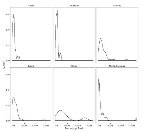 The results show that if we want to make the most bang for our buck, we need to market Zombie Wars as a horror movie. The horror genre performs best in terms of percentage increase in profit and total profit. One can see from the distributions, particularly of total profit, that horror movies tend to have a low amount of variability, while making a substantial amount of profit. Comedies also appear to do well, but unless we want to dupe people with the title Zombie Wars, it is best that we stick to a script and marketing campaign geared toward horror fans.